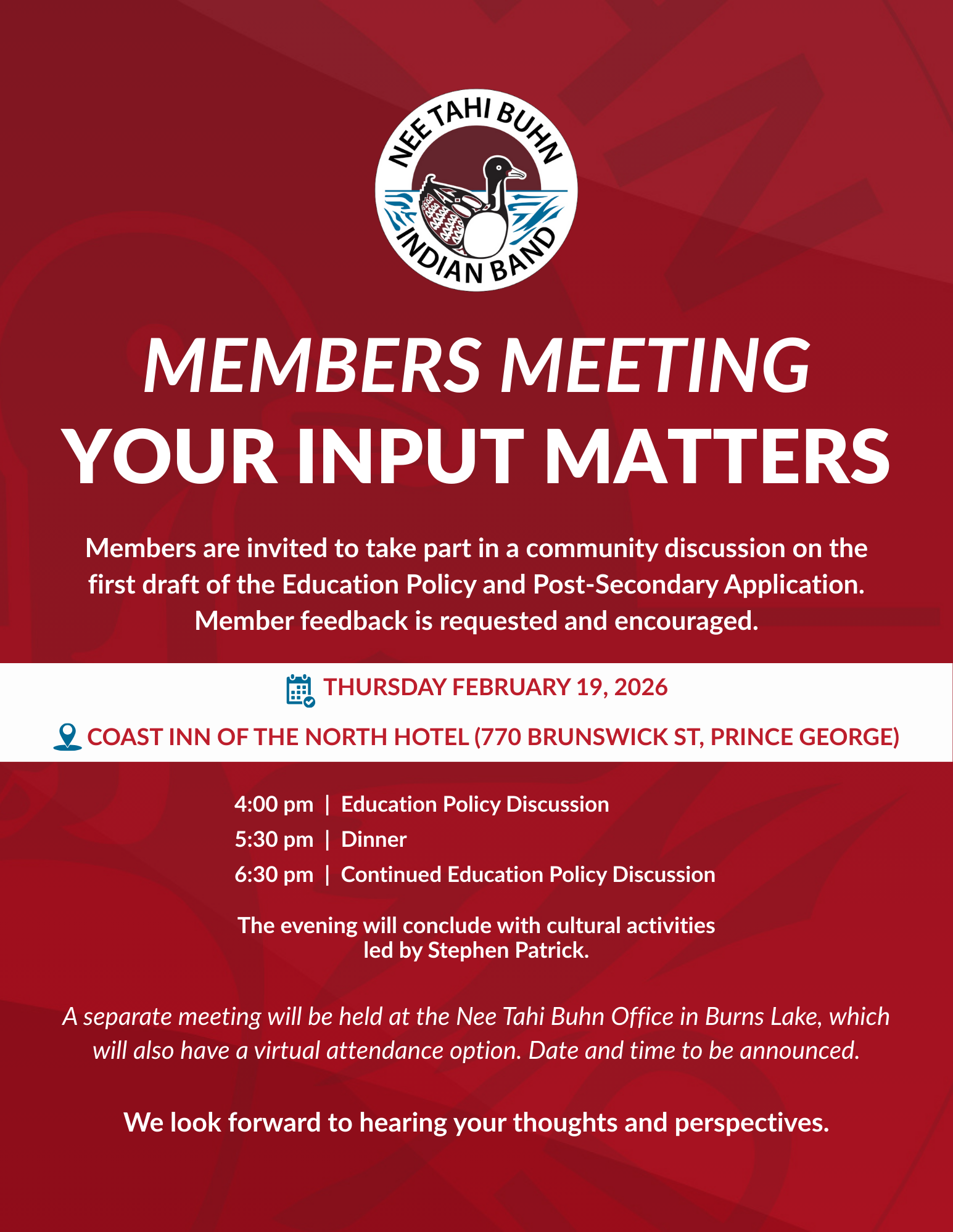A separate meeting will be held at the Nee Tahi Buhn Office in Burns Lake with a virtual option. Date and time to be announced.