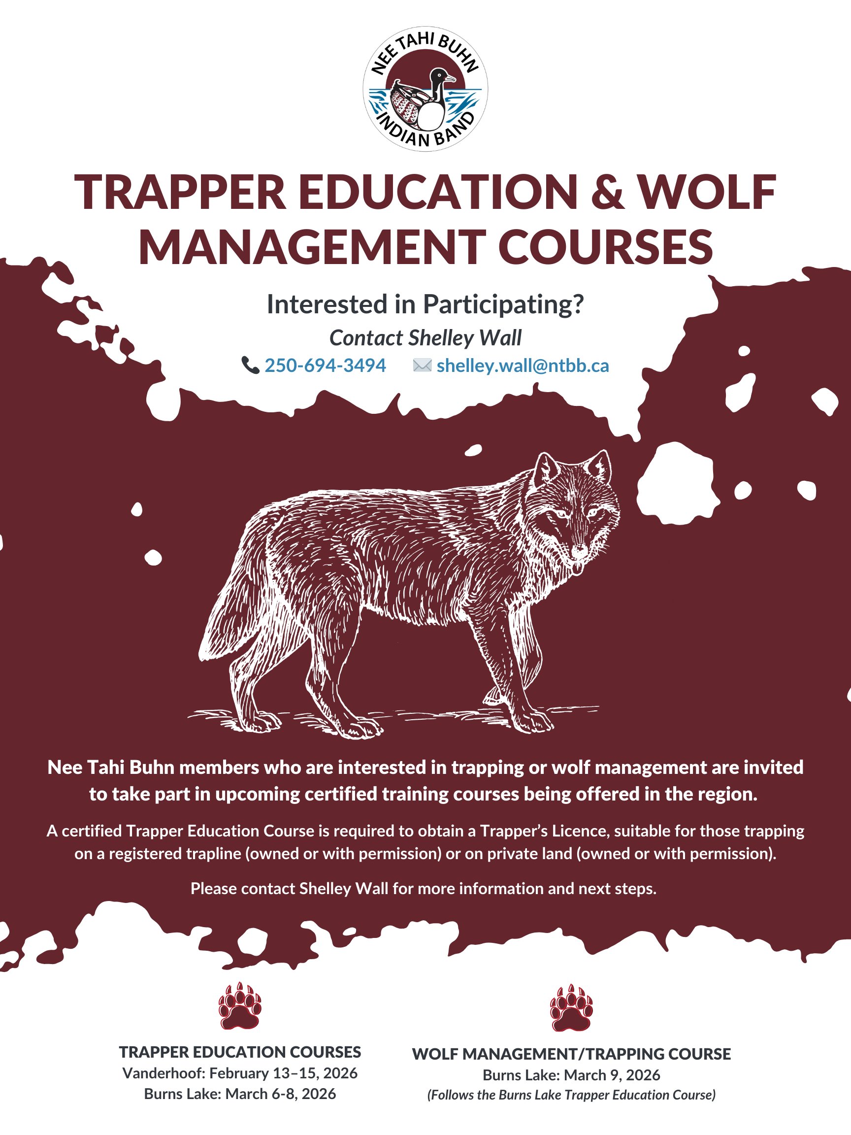 Nee Tahi Buhn members who are interested in trapping or wolf management are invited to take part in upcoming certified training courses being offered in the region. A certified Trapper Education Course is required to obtain a Trapper’s Licence, suitable for those trapping on a registered trapline (owned or with permission) or on private land (owned or with permission). Please contact Shelley Wall for more information and next steps at 250-694-3494 or shelley.wall@ntbb.ca.