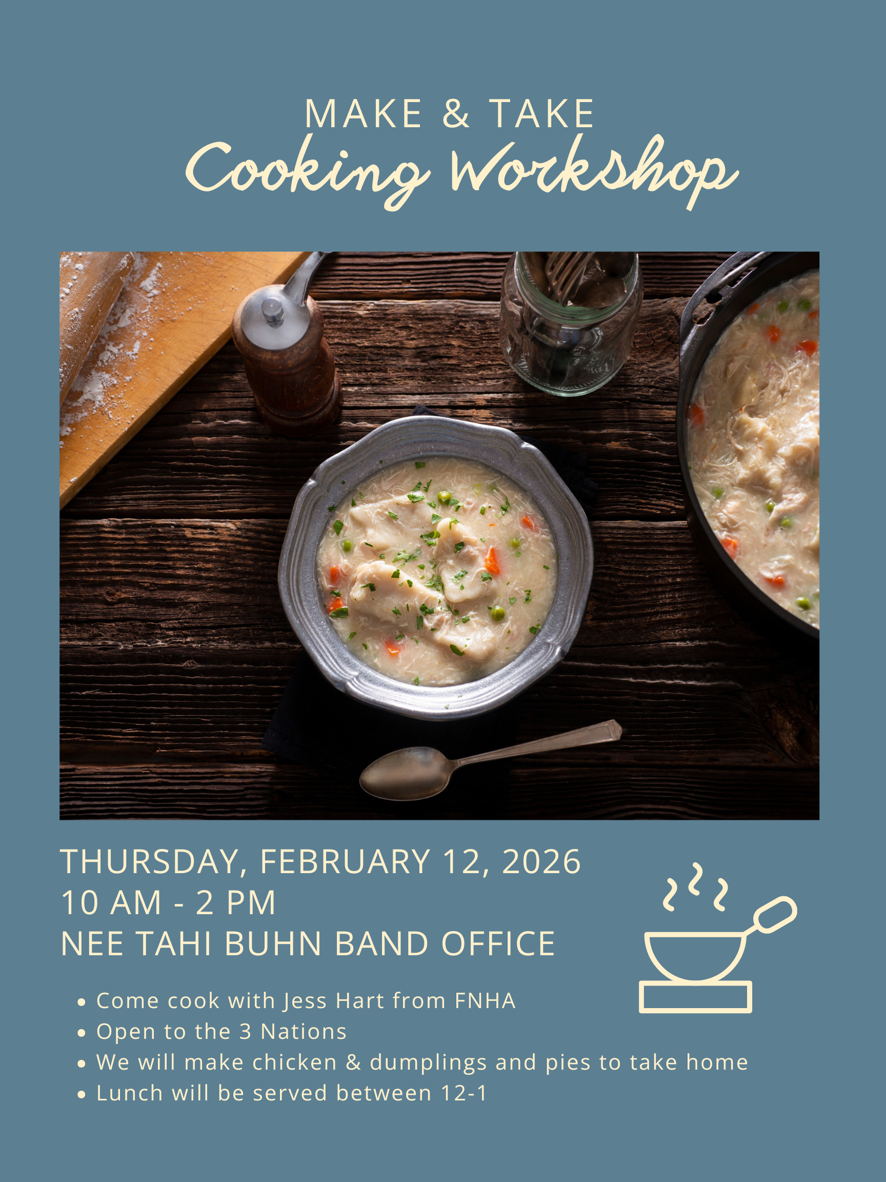 The 3 Nations are invited to a Make & Take Cooking Class with Jess Hart from the First Nations Health Authority. The group will make chicken & dumplings and pie to take home, and lunch will be served between 12PM – 1PM.