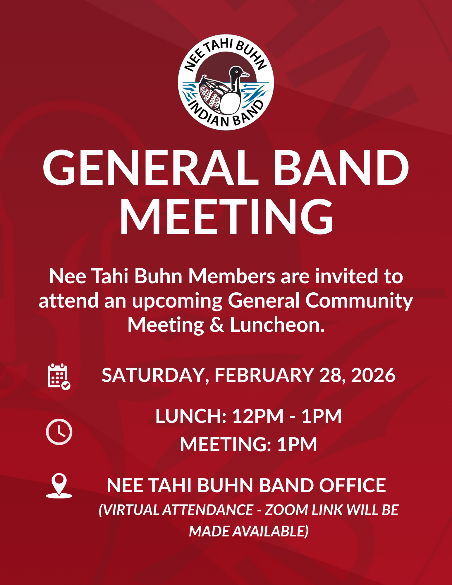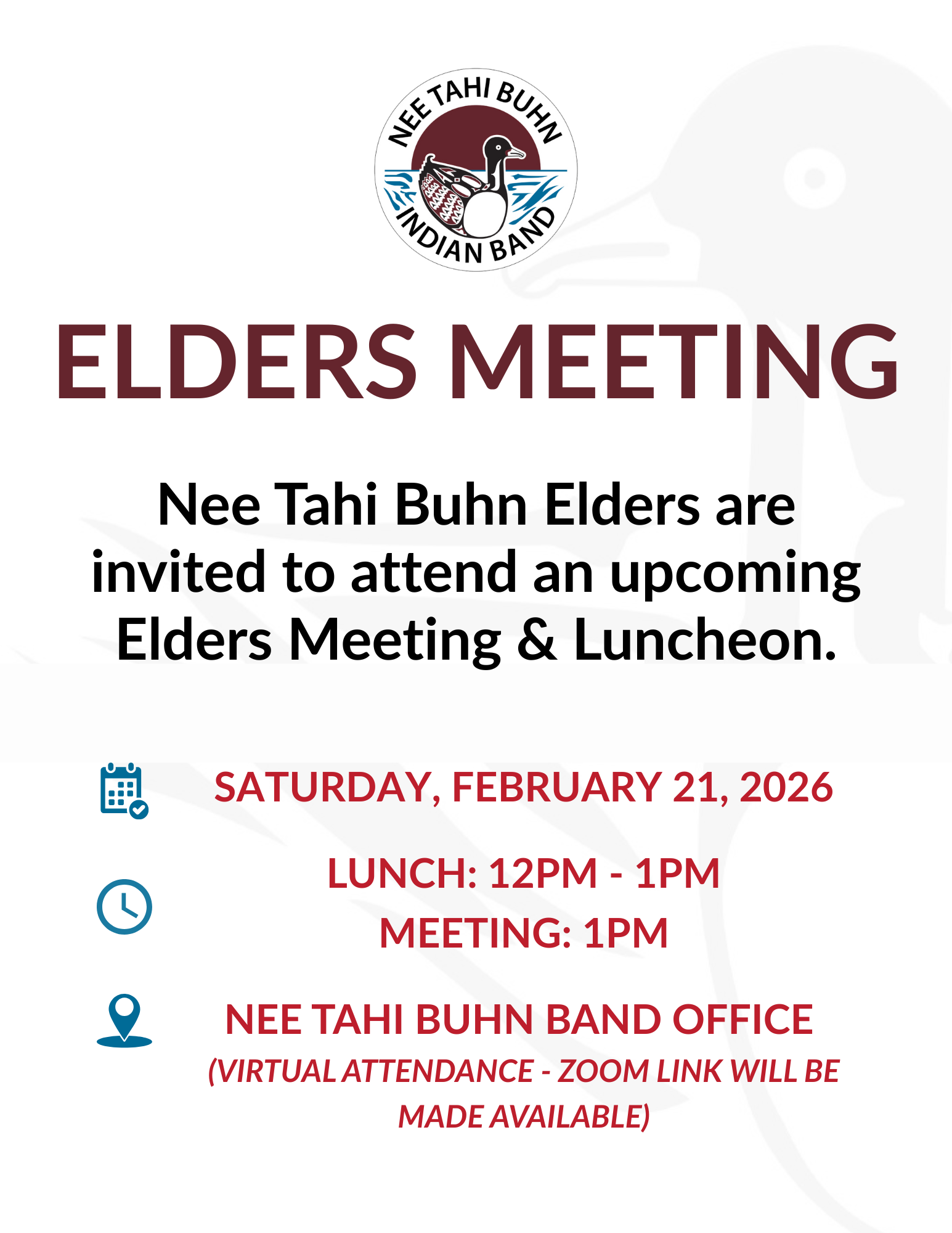 Nee Tahi Buhn Elders are invited to attend an upcoming Elders Meeting & Luncheon.