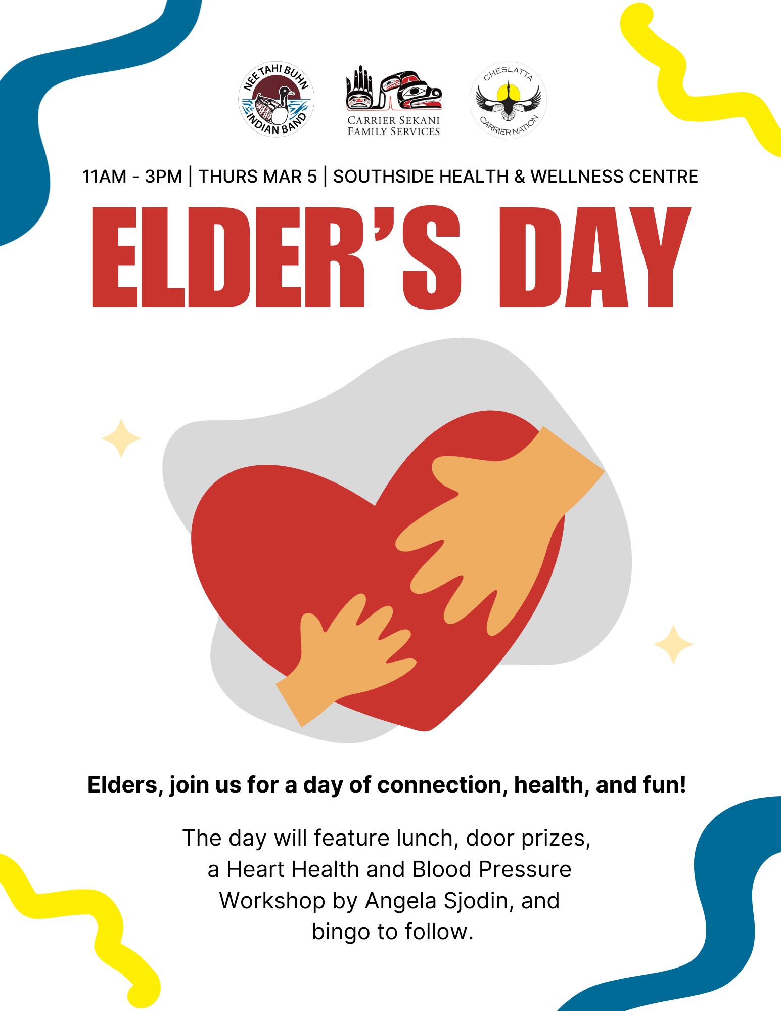 Elders, join us for a day of connection, health, and fun! The day will feature lunch, door prizes, a Heart Health and Blood Pressure Workshop by Angela Sjodin, and bingo to follow.