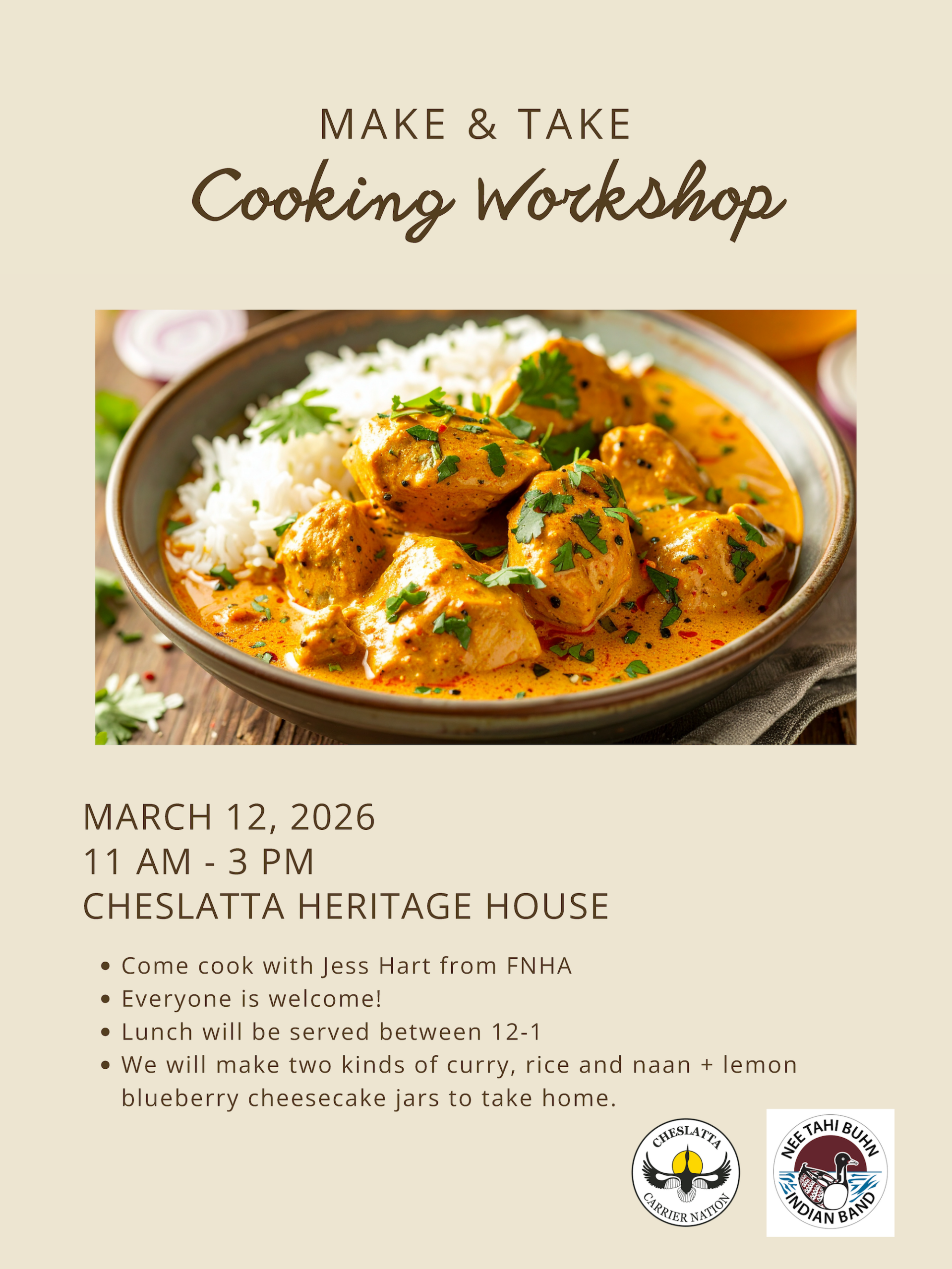 Members from the 3 Nations: come cook with Jess Hart from FNHA! Lunch will be served between 12PM – 1PM and we will make two kinds of curry, rice, and naan + lemon blueberry jars to take home.