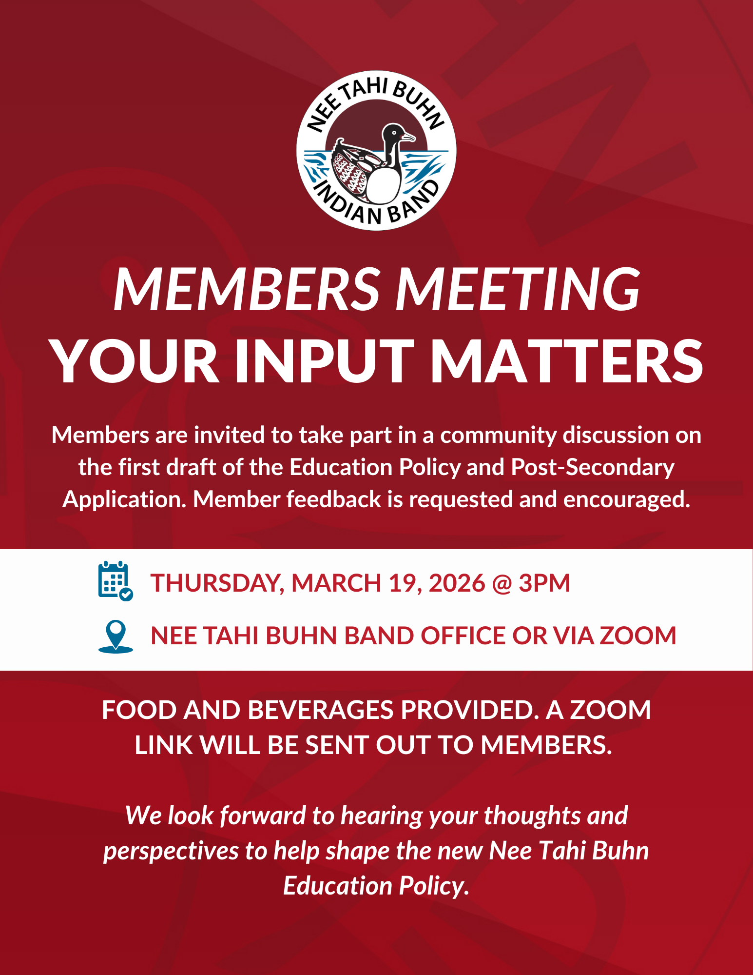 Members are invited to take part in a community discussion on the first draft of the Education Policy and Post-Secondary Application. Member feedback is requested and encouraged. Food and beverages provided. A Zoom link will be sent out to members. We look forward to hearing your thoughts and perspectives to help shape the new Nee Tahi Buhn Education Policy.